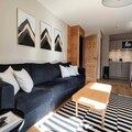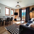 The kitchen is fully equipped with modern appliances, including a dishwasher, oven, microwave, and coffee maker. The living area leads to a west-facing terrace with stunning views of the Aigueblanche valley. Additional amenities include a ski locker with a boot dryer, a washing machine and dryer, two bathrooms, and baby equipment like a crib and high chair, making it perfect for families.
