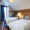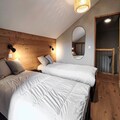 This 76 m² duplex chalet accommodates 6 people with three bedrooms. The first level has a double bedroom, a spacious living area with a sofa, TV, and a dining table for six. Upstairs, there is a second double bedroom and a room with two single beds. The chalet includes two parking spaces (covered and outdoor), bed and bathroom linens, and end-of-stay cleaning (excluding kitchen and dishes). It is non-smoking and pets are not allowed, providing a clean and comfortable stay.