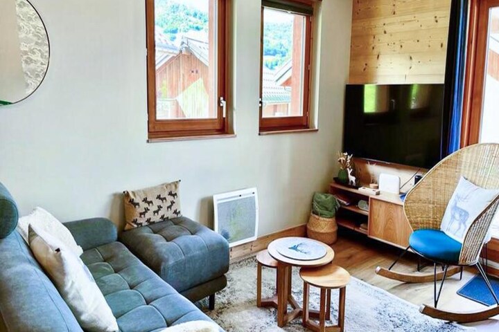Located in La Charmette, the chalet is directly on the ski slopes, offering ski-in/ski-out access. The resort center is a 3 km drive away, with free public shuttle access. Nearby activities include hiking, skiing, and mountain biking. Restaurants, a sports store, and markets are available, making it easy to enjoy both summer and winter vacations. Valmorel is known for its family-friendly atmosphere and a variety of après-ski activities.