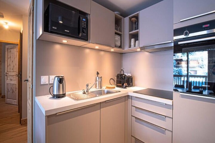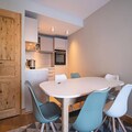 The apartment includes a fully equipped kitchen with a dishwasher, microwave, Nespresso machine, and a raclette set, making meal preparation convenient and enjoyable. The spacious living room has a TV and a sofa with a chaise longue, while the east-facing balcony offers stunning mountain views. There is a shower room with a towel dryer, and underfloor heating ensures comfort throughout your stay.
