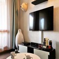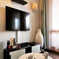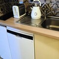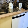 The apartment boasts a fully-equipped kitchenette with modern appliances, including a fridge, microwave oven, and dishwasher. It also features ceramic hobs, a Nespresso coffee maker, and a toaster. For entertainment, guests can enjoy a Philips flat-screen TV, a BOSE sound bar, and a Sony Blu-ray DVD player. The bathroom is complete with a shower and toilet, and the apartment is equipped with a Dyson vacuum cleaner for added convenience.