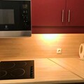 The apartment features a well-equipped kitchenette, complete with a Philips 660 dishwasher, Scholtès fridge, oven, and 4 electric hotplates for cooking meals. Additional appliances include a coffee maker, kettle, toaster, and everything you need for a comfortable stay. A separate bathroom and toilet offer privacy and convenience, while the balcony provides a relaxing space to enjoy the surrounding mountain views.