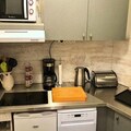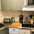The apartment features a well-equipped kitchenette, complete with a Philips 660 dishwasher, Scholtès fridge, oven, and 4 electric hotplates for cooking meals. Additional appliances include a coffee maker, kettle, toaster, and everything you need for a comfortable stay. A separate bathroom and toilet offer privacy and convenience, while the balcony provides a relaxing space to enjoy the surrounding mountain views.