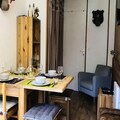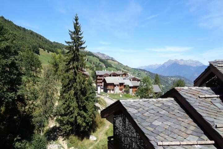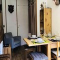 The apartment is equipped with a well-stocked kitchenette, including a fridge, dishwasher, 2 electric hotplates, a mini oven, and a Nespresso coffee machine. It also offers additional kitchen amenities such as a coffee maker, toaster, and appliances for a raclette and fondue. The bathroom is complemented by a separate toilet, while the private terrace provides a lovely outdoor space furnished with a table and chairs, perfect for enjoying the mountain air.