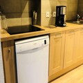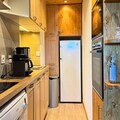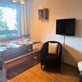 The fully equipped kitchen includes a refrigerator, Bosch dishwasher, 3-burner ceramic hob, traditional oven, microwave, toaster, kettle, and Nespresso coffee maker. Additional amenities include a washer-dryer, hairdryer, ski locker, and a bathroom with a shower and toilet. A northwest-facing balcony offers scenic valley views, perfect for relaxing after a day on the slopes.