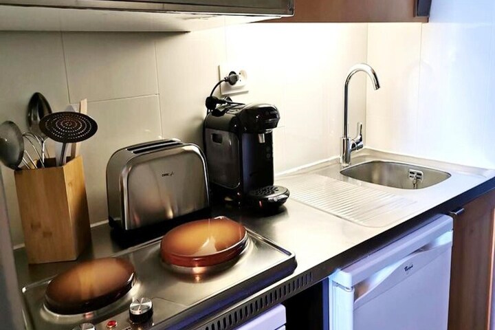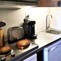 The studio is equipped with a kitchenette featuring a fridge, dishwasher, traditional oven, microwave, electric hobs, Nespresso coffee maker, kettle, and toaster for all your culinary needs. A raclette machine for four people is also provided for cozy meals in. The bathroom includes a toilet, and the apartment has a balcony with a lovely valley view. Additional amenities include a TV with a DVD player, hairdryer, shoe cabinet, and vacuum cleaner, ensuring your comfort throughout your stay. Heating is available for a pleasant atmosphere.