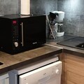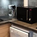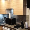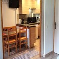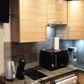 The apartment includes a kitchenette, fully equipped for your convenience, with a fridge, dishwasher, ceramic hobs, and both an electric coffee maker and a Dolce Gusto machine. The bathroom is complemented by a separate toilet. A balcony with a table and chairs offers a great space to relax and take in the views. Additional amenities include a Bosch vacuum cleaner, toaster, kettle, and appliances such as a fondue and raclette machine.