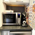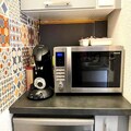 The studio is equipped with a separate kitchenette, including 2 induction hobs, a microwave, a Senseo coffee maker, a kettle, and a toaster. A dishwasher and a combined washing machine and dryer are also provided for your convenience. The bathroom is complemented by a separate toilet. The apartment also features a balcony with a table and 4 chairs, perfect for enjoying a meal outdoors. Appliances like a fondue/raclette machine and a croque monsieur maker are available to enhance your stay.