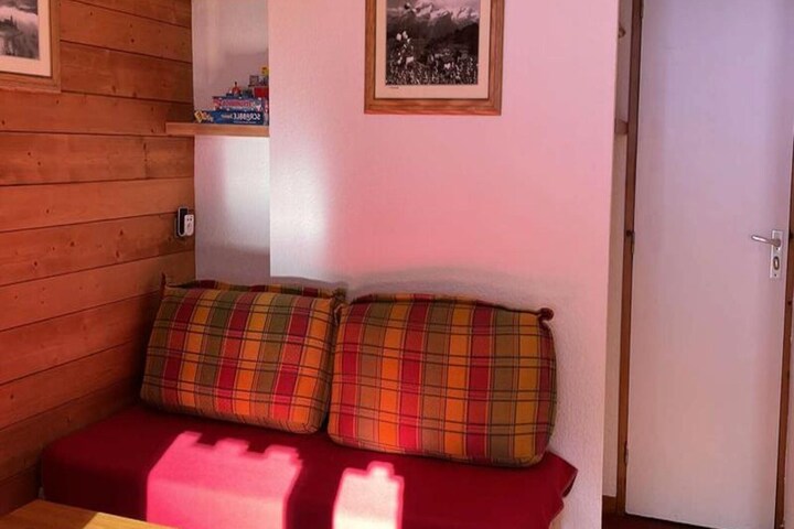 This cozy studio is designed to accommodate up to 4 guests. The divisible living room features 4 single beds, two on each side of a movable partition, and all beds are equipped with duvets for comfort. The apartment is non-smoking and pets are not allowed. While linen, parking, and cleaning are not included, they can be booked for an additional fee. A ski locker is available for your convenience, making it ideal for those who love winter sports.