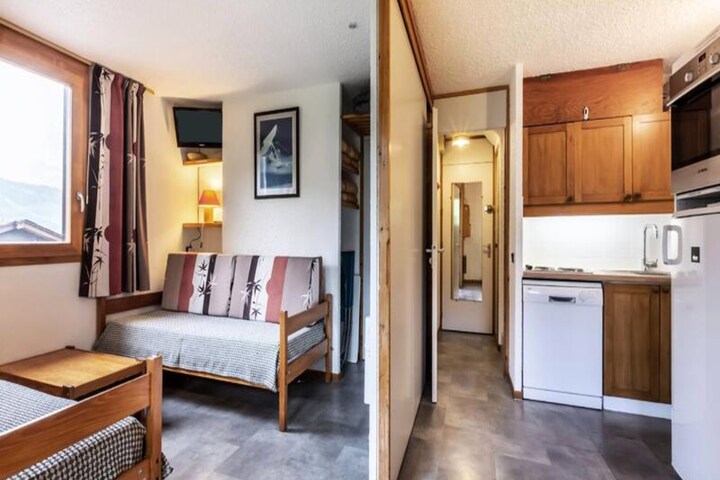 Positioned perfectly in the Crève Coeur district of Valmorel, this charming 3-room duplex offers an unparalleled ski-in/ski-out experience. Imagine stepping onto your balcony with views of the slopes, breathing in crisp alpine air, and knowing the Télèbourg ski lift is just 100 meters away, ready to whisk you into the heart of the mountains. Whether you're here to carve through fresh powder or explore scenic trails, this apartment promises effortless access to adventure and relaxation alike. \n\nInside, the 36m² duplex has been thoughtfully renovated to combine modern comfort with alpine charm. The living room features two cozy single sofa beds, while the bedroom and mezzanine offer additional sleeping arrangements with single beds, making it ideal for families or groups of up to six. A fully equipped kitchen awaits, complete with a dishwasher, induction hob, oven, microwave, and a spacious refrigerator/freezer, perfect for preparing hearty meals after a day on the slopes. The apartment also includes a bathroom with a washing machine, a separate toilet, and an upstairs shower room with an additional toilet, ensuring convenience for all guests. \n\nThe Crève Coeur district is a hub of convenience, with shops, a bakery, and a mini-market just steps away. The ESF ski school is only 300 meters from your door, making this location ideal for both beginners and seasoned skiers. In summer, the area transforms into a haven for hikers and nature enthusiasts, with trails that wind through breathtaking landscapes. \n\nWhether you're seeking thrilling winter sports or serene summer escapes, this duplex is your gateway to the enchanting beauty of Valmorel. With its prime location, modern amenities, and cozy atmosphere, it’s the perfect base for creating unforgettable alpine memories.