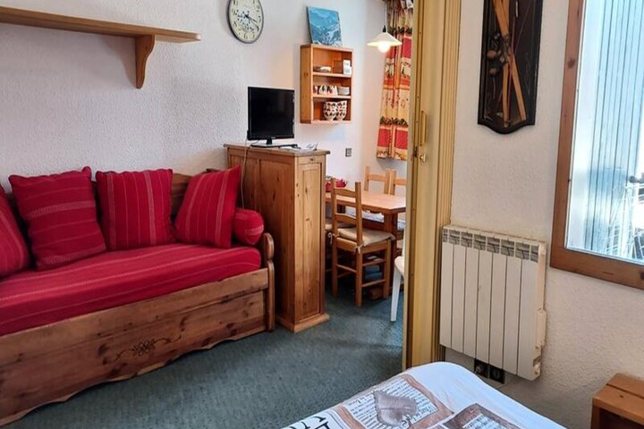 On the edge of Valmorel's enchanting La Forêt district, this cozy studio apartment offers a perfect blend of comfort and convenience for your alpine getaway. Imagine waking up to serene mountain views from your northeast-facing balcony, stepping out to the slopes just 100 meters away, and enjoying effortless access to Le Grand Domaine via the Altispace chairlift. Whether you're here for skiing, hiking, or simply soaking in the tranquil atmosphere, this charming retreat is your gateway to the best of the French Alps. \n\nThe 27 m² apartment is thoughtfully designed to maximize space and functionality. The entrance hall features a fully equipped kitchen with a dishwasher, electric hob, microwave, refrigerator, and even a raclette grill for cozy evenings. The dining area comfortably seats four, while the divisible living room offers flexible sleeping arrangements with a trundle bed and a double bed. A separate bathroom and toilet ensure privacy, and pets are welcome for a small fee. While Wi-Fi is not included, the apartment provides a ski locker for your gear and promises a smoke-free environment for your stay. \n\nLocated in the quiet La Forêt district, the residence \