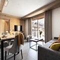 The apartments are thoughtfully designed for up to six guests, featuring a living room with a convertible sofa, a fully equipped kitchen, a double bedroom, a twin bedroom, and two bathrooms. Enjoy the fresh mountain air from your private balcony, and take advantage of modern amenities like free Wi-Fi, a baby kit, and an electric car charging station. Pets are welcome too, ensuring every member of the family can join the adventure.