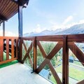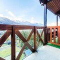 The apartment, spanning 40m², includes a living room with a sofa bed, a cabin area with bunk beds, a bedroom with two single beds, and two bathrooms. Guests can enjoy the fresh mountain air from the balcony, and the kitchen is equipped for self-catering.