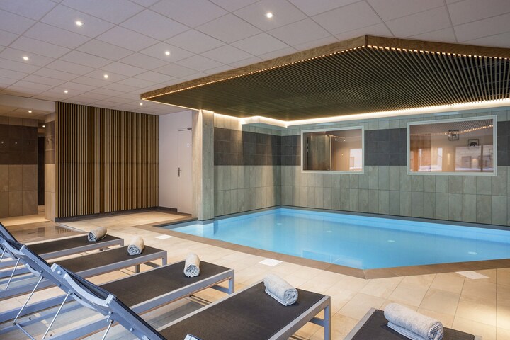 The residence is built on a hill about 300m from the first (chair) lift 'Le Grand Mont'. Within walking distance are shops, bars, restaurants, Skiset shop and the Tourist Office. The indoor swimming pool (free entrance), sauna, steam bath, jacuzzi and fitness room are accommodated in the well-kept Spa (1 to 3 x free entrance, depending on the type of apartment). There is also a nice reception (sandwich service), cosy lounge with fireplace, elevators, parking garage, luggage room and ski storage space.