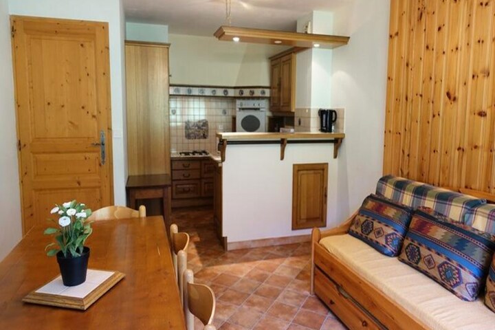 In the heart of the serene Planay village, this charming 46m² apartment offers a cozy retreat for up to six guests, perfectly situated at the foot of the slopes. Surrounded by the breathtaking beauty of the French Alps, this property invites you to immerse yourself in nature’s tranquility while enjoying the comforts of a well-equipped mountain home. Whether you’re seeking a winter wonderland or a summer escape, this location promises unforgettable moments at an altitude of 1,200 meters. \n\nThe apartment features a warm and inviting living room with a pull-out sofa, a fully equipped kitchen, a separate bedroom with a double bed, and a sleeping alcove with bunk beds. A south-facing balcony provides stunning views of the surrounding peaks, perfect for enjoying your morning coffee or unwinding after a day of adventure. Modern amenities such as a dishwasher, washing machine, heated ski locker, and parking space ensure a seamless and comfortable stay. \n\nLocated just 3 km from the charming village of Arèches, you’ll find yourself at the gateway to a variety of outdoor activities. In winter, enjoy direct access to pristine ski slopes, while summer unveils lush mountain pastures and scenic hiking trails. The area’s natural beauty is complemented by its welcoming alpine atmosphere, making it an ideal destination for families and outdoor enthusiasts alike. \n\nWith its unbeatable location and thoughtful amenities, this apartment is your perfect base for exploring the wonders of the Beaufortain region. Book your stay and create lasting memories in this idyllic alpine retreat.