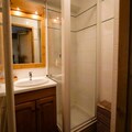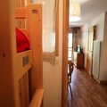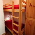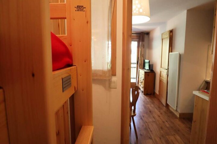 The apartment spans 30m² and is thoughtfully designed to maximize comfort and functionality. It features two inviting bedrooms: one with bunk beds nestled under skylights, perfect for a cozy night’s rest, and another with a plush double bed. The living space is warm and welcoming, complete with a comfortable sofa and a TV for unwinding after a day of exploration. The well-equipped kitchen, including a dishwasher and washing machine, makes meal preparation a breeze, while the modern bathroom with a shower ensures a refreshing start or end to your day. Additional amenities such as a ski locker and elevator add to the convenience of your stay.