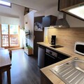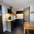 The apartment spans 33m² with an additional 10m² of mezzanine space, offering a functional and comfortable layout. The bright living room opens onto a south-facing balcony, complete with garden furniture, where you can soak in the mountain views. The kitchenette is fully equipped with a dishwasher, oven, and microwave, making meal preparation a breeze. The sleeping arrangements include a small bedroom with two single beds and a mezzanine with two additional single beds, ensuring restful nights for all. Additional amenities include a flat-screen TV, a ski locker, and an elevator for easy access.