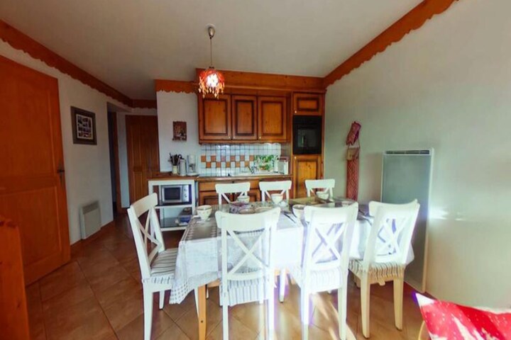 In the heart of the French Alps, where pristine landscapes meet modern comfort, this elegant apartment offers a serene escape for families and groups. Located within a high-end residence just 5.6 km from the center of Les Saisies, the property combines alpine charm with luxurious amenities, including a heated indoor swimming pool available during peak winter and summer seasons. With its south/east-facing balcony, guests can soak in the breathtaking mountain views while enjoying the crisp alpine air. The residence also features covered parking for added convenience. \n\nThis thoughtfully designed 3-room apartment is situated on the first floor with elevator access, ensuring ease of entry for all guests. The layout includes a cozy living room with a double sofa bed, a master suite with a double bed and en-suite shower room, and a second bedroom equipped with bunk beds and a pull-out bed, ideal for families with children. The open-plan kitchen seamlessly connects to the living area, creating a warm and inviting space for shared meals and relaxation. Additional features include a separate bathroom and WC, ensuring privacy and comfort for everyone. \n\nBeyond the residence, the surrounding area offers endless opportunities for adventure and exploration. Les Saisies is renowned for its picturesque trails, perfect for hiking and cycling in summer, and its world-class ski slopes during winter. Guests can also indulge in local Savoyard cuisine at nearby restaurants or explore charming alpine villages. With its proximity to nature and vibrant cultural experiences, this location is ideal for creating unforgettable memories. \n\nWhether you’re seeking thrilling outdoor activities or tranquil moments in the mountains, this apartment provides the perfect base for an exceptional alpine getaway.