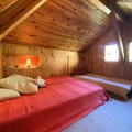 Inside, the chalet is thoughtfully designed to accommodate up to 12 guests across three floors. The ground floor features a practical ski room, a cozy twin bedroom with a cot, and two additional twin bedrooms, along with a bathroom and laundry facilities. The first floor, accessible via a charming balcony or interior stairs, boasts a fully equipped kitchen with everything from a raclette machine to a crepe maker, a spacious dining area, and a bright lounge opening onto the terrace. A double bedroom and a bathroom complete this level. The top floor, with its cozy, cabin-like rooms under sloped ceilings, is perfect for children aged 6 to 12, offering a whimsical retreat.