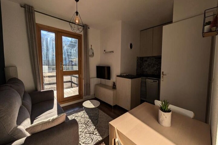 In the heart of the charming Arèches-Beaufort region, this beautifully renovated apartment offers a cozy retreat for up to three guests. Surrounded by breathtaking alpine scenery, it’s the perfect base for exploring the area’s natural beauty and enjoying a tranquil escape. Whether you’re visiting in winter for the snow-covered slopes or in summer for the lush green landscapes, this property promises an unforgettable stay. \n\nStep inside this thoughtfully designed 25m² apartment and discover a modern, welcoming space. The bright living room, featuring a comfortable rapido sofa bed, opens onto a spacious terrace where you can soak in the stunning views of the surrounding peaks. The fully equipped kitchenette includes a dishwasher, a combination microwave oven, and a cozy island for casual dining. A separate bedroom with a double bed ensures restful nights, while the modern bathroom with a bathtub adds a touch of luxury. Ample storage in the entrance hall ensures a clutter-free stay, and additional amenities like a TV and a ski locker provide extra convenience.\n\nLocated within the friendly Val Blanc II residence, the apartment is just a short walk from the ski slopes and the village center. In summer, guests can enjoy access to the shared swimming pool, making it an ideal destination year-round. Nearby, you’ll find charming local shops, restaurants, and outdoor activities that showcase the best of the region. From hiking trails to ski adventures, Arèches-Beaufort offers something for everyone.\n\nWhether you’re seeking adventure or relaxation, this modern and functional apartment is your gateway to the enchanting beauty of the French Alps. Book your stay today and create lasting memories in this idyllic alpine retreat.