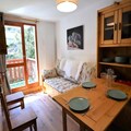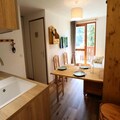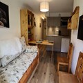 The apartment features a functional layout with a welcoming living room that includes a pull-out sofa, a well-equipped kitchenette complete with a dishwasher, and a snug bedroom with a double bed. The shower room is modern and practical, while the west-facing balcony provides a stunning view of the surrounding peaks, perfect for unwinding after a day of exploration. During the summer months, guests can enjoy access to the shared swimming pool in the residence, adding a refreshing touch to their holiday.