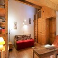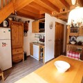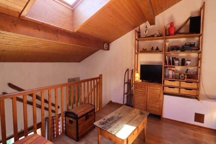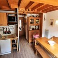 Spanning 50 m², the apartment is thoughtfully designed to accommodate up to seven guests. On the ground floor, you’ll find a cozy dining area with a fully equipped kitchenette featuring a microwave, refrigerator, and dishwasher, as well as a comfortable double bedroom. The mezzanine level opens to a spacious living room with two sofa beds, leading to a charming bedroom with bunk beds, ideal for children. Modern amenities such as a flat-screen TV, DVD player, stereo system, and a selection of games and books ensure entertainment for all ages. The property also includes a ski locker and a fully equipped bathroom with drying facilities, adding convenience to your stay.