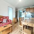 Designed to comfortably accommodate up to 8 guests, the apartment features two welcoming bedrooms, a mountain corner with bunk beds, and additional sleeping options in the living room. The open-plan kitchen and living area is perfect for gathering after a day on the slopes, equipped with modern amenities such as a dishwasher, filter coffee machine, and even a raclette grill for a true taste of the Alps. The bathroom, complete with a relaxing bathtub, and a separate toilet add to the convenience and comfort of your stay.