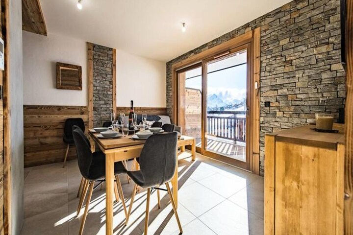 Beneath the towering peaks of the Aiguilles d'Arves, this brand-new alpine apartment offers an unparalleled ski-in, ski-out experience along the blue Marmotte slope. Imagine stepping out of your residence and gliding directly onto the snow front, where the Bellard chairlift and main ski lifts await to whisk you into the heart of the French Alps. With pedestrian access to the resort just minutes away, you’re perfectly positioned to enjoy both thrilling mountain adventures and the vibrant village atmosphere. \n\nInside, the 53m² apartment is a haven of warmth and elegance, featuring high-quality materials and thoughtful design. The living room opens onto a balcony with breathtaking views of the surrounding peaks, creating a serene space to unwind after a day on the slopes. A cozy lounge-dining area and a fully equipped kitchen make it easy to share meals and moments with loved ones. The sleeping arrangements are ideal for families or groups, with two bedrooms offering queen-size beds—one with its own television—and a third bedroom with bunk beds. A modern bathroom and separate toilet complete the layout, ensuring comfort and convenience for all guests.\n\nThe residence boasts premium amenities, including an indoor parking space, a ski locker with a boot dryer, and Wi-Fi. End-of-stay cleaning, bed linen, and towels are included, so you can focus entirely on relaxation. By booking in advance, you’ll also enjoy exclusive discounts on lift passes and ski equipment, delivered directly to your apartment upon arrival.\n\nWhether you’re here to carve through pristine powder, explore scenic trails, or simply soak in the alpine charm, this apartment promises unforgettable moments for families and friends alike. Reserve your stay today and embrace the magic of the mountains in every season.