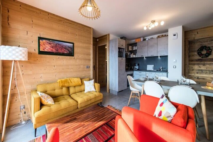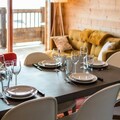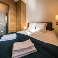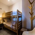 The apartment features a living room opening onto a balcony and a sublime view of the Aiguilles d'Arves. The living room offers a lounge/dining area and a fully equipped kitchen. A first bedroom with its own bathroom is equipped with a queen-size bed. The second bedroom also offers a queen-size bed and a TV. It shares a bathroom with the sleeping area and its bunk bed (the top bunk is not suitable for children under 6 years old). Finally, a separate toilet completes this property. End-of-stay cleaning is included, as are bed linen and bathroom linen rentals.