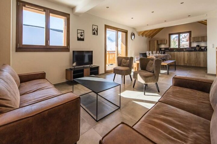 In the heart of the French Alps, where pristine slopes meet the golden glow of the winter sun, Sylodges Residence offers a luxurious escape for ski enthusiasts and nature lovers alike. Apartment 101, a stunning duplex on the ground floor, combines modern elegance with alpine charm, creating the perfect setting for unforgettable moments with family or friends. Imagine stepping out onto the south-facing balcony, soaking in the breathtaking mountain views, and breathing in the crisp alpine air before heading straight to the Soleil slope for a day of adventure. With ski-in/ski-out access and proximity to the Soleil chairlift, your alpine dreams are just steps away. \n\nThis thoughtfully designed apartment accommodates up to 10 guests, making it ideal for two families or a group of friends. The first level features a cozy living area with a TV and sofa, a dining room, and a fully equipped kitchen with state-of-the-art appliances, including an induction hob, oven, microwave, and dishwasher. A laundry room, storage space, and separate toilet add convenience, while the 6.5m² balcony invites you to relax and take in the stunning surroundings. On the garden level, the sleeping quarters include a double bedroom with a private bathroom, a family room with a double bed, bunk beds, and an en-suite bathroom, and a spacious dormitory with bunk beds. Additional amenities include a ski locker with a boot dryer and two outdoor parking spaces. \n\nBeyond the apartment, the Sylodges Residence offers seamless access to ski lessons, discounted lift passes, and equipment rentals, ensuring a hassle-free holiday. Whether you’re exploring the slopes or enjoying the vibrant après-ski atmosphere, everything you need is at your fingertips. In summer, the region transforms into a haven for hikers and cyclists, with trails winding through lush landscapes and alpine meadows. \n\nBook your stay at Sylodges Residence and experience the magic of the French Alps, where every moment is an invitation to adventure and relaxation.