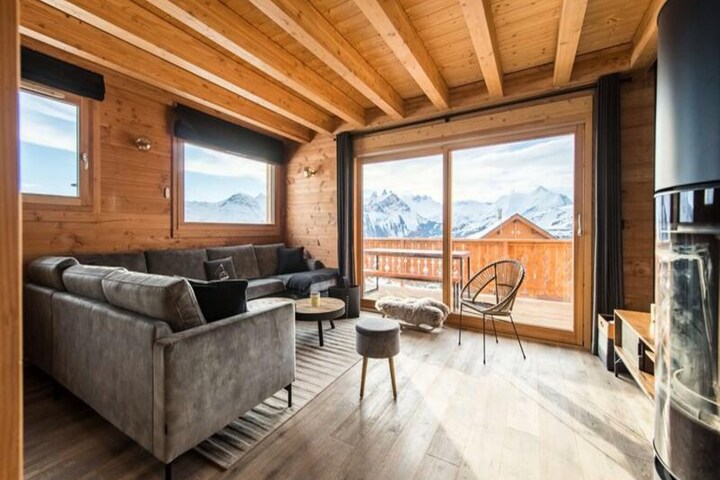 High above the serene alpine landscapes, this stunning chalet invites you to experience the beauty of the French Alps in unmatched comfort. With its south-facing orientation, Lake Louise fills with natural light, offering breathtaking 180° views of the majestic Aiguilles d'Arves peaks. Whether you're seeking adventure on the slopes or tranquil moments by the fire, this property is designed to create unforgettable memories. From the garden-level entrance, equipped with ski storage and boot dryers, every detail has been thoughtfully curated for your convenience and enjoyment. \n\nThe chalet boasts a spacious layout across three levels, accommodating up to 12 guests. On the ground floor, you'll find a cozy double bedroom, a dormitory with two bunk beds, a bathroom with double sinks, and a laundry room. The heart of the home lies in the expansive living area, where a fully equipped kitchen, dining space, and a comfortable lounge with a fireplace open onto a terrace with panoramic views. Upstairs, the master suite features its own bathroom and a private balcony, while additional bedrooms and a dormitory provide ample space for families or groups. Modern amenities such as Wi-Fi, an electric charging station, and end-of-stay cleaning ensure a stress-free stay. \n\nLocated near world-class ski slopes, this chalet offers seamless access to lift passes and ski lessons, delivered straight to your door upon arrival. Guests can also enjoy exclusive discounts on equipment rentals and passes when booking in advance. Beyond skiing, the region transforms into a summer paradise with hiking trails, mountain biking, and breathtaking vistas. Whether you're exploring the pristine surroundings or relaxing in the warmth of the chalet, Lake Louise is your gateway to the wonders of the Alps. Book now and immerse yourself in the magic of this alpine retreat.