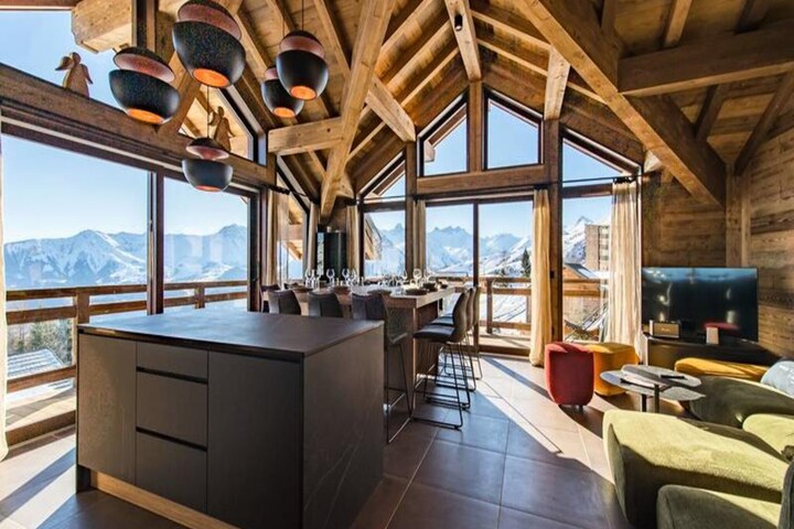 High above the picturesque slopes of the French Alps, this luxurious chalet invites you to experience an unforgettable mountain escape. Bathed in natural light from its south-facing design, the property offers breathtaking views that stretch across the serene alpine landscape. Whether you're seeking adventure or relaxation, this chalet provides the perfect setting for cherished moments with family and friends. From the moment you arrive, you'll feel the warmth and sophistication of its thoughtfully curated decor, blending modern comfort with timeless alpine charm. \n\nThe chalet spans three floors, each designed to cater to your every need. On the garden level, you'll find a convenient ski room for secure storage, alongside a laundry room equipped with a washer and dryer. The ground floor features a master suite with a queen-size bed and private shower room, a dormitory with three bunk beds accommodating up to six guests, a second shower room, and two separate toilets. The first floor boasts two elegant master suites, one with a king-size bed and the other with a queen-size bed, each with its own shower room and separate toilet. A sauna and pantry complete this level, offering relaxation and practicality. The crowning glory is the attic living area on the top floor, where a cozy lounge, a spacious dining room, and a fully equipped kitchen await. The kitchen is outfitted with premium appliances, including two dishwashers, a 90cm induction hob, oven, and microwave, ensuring effortless meal preparation. \n\nLocated in the heart of the Alps, the chalet is perfectly positioned for ski enthusiasts, with lift passes and ski lesson cards conveniently delivered to your door upon arrival. Guests who book in advance can enjoy exclusive discounts on ski equipment rentals and lift passes through trusted partners. Beyond skiing, the region offers a wealth of activities, from scenic hiking trails to vibrant local markets showcasing Savoyard specialties. \n\nWith end-of-stay cleaning, bed linen, and bathroom linen included, this chalet ensures a seamless and stress-free holiday experience. Whether you're unwinding in the sauna after a day on the slopes or sharing a meal in the inviting dining area, every moment here is designed to create lasting memories. Book now and let the magic of the French Alps envelop you in a world of beauty and tranquility.