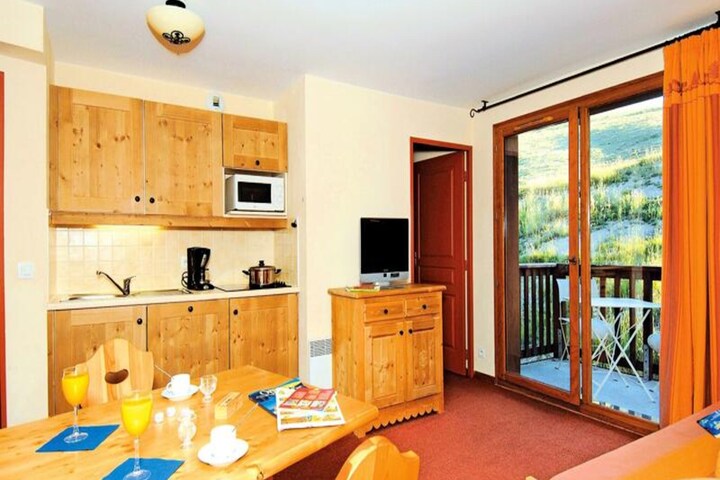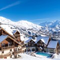 At the foot of the majestic peaks of Les Sybelles, this charming residence invites you to immerse yourself in the serene beauty of the French Alps. Just 50 meters from the Milky Way chairlift, Goélia Les Alpages du Corbier*** offers a perfect blend of traditional mountain architecture and modern comforts, making it an ideal retreat for ski enthusiasts and nature lovers alike. Whether you're seeking thrilling adventures on the slopes or tranquil moments surrounded by alpine vistas, this property promises unforgettable experiences. \n\nThe residence comprises three cozy chalets, each thoughtfully designed to provide warmth and relaxation. Guests can enjoy the heated outdoor swimming pool, unwind in the sauna, or stay active in the small fitness area—all conveniently located on-site. Accommodations are equipped with a living room featuring a pull-out sofa bed, a fully equipped kitchen, and a comfortable bedroom with options for double beds or bunk beds. Additional amenities include WiFi access, television, and optional extras such as linen kits and baby equipment to ensure a hassle-free stay. \n\nSituated in the heart of Le Corbier, a family-friendly resort awarded the \