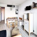 This 28m² studio is thoughtfully designed to accommodate up to four adults and one child, featuring a sleeping alcove with bunk beds and a pull-out bed, as well as a comfortable sofa bed in the living area. The kitchenette is equipped with all the essentials, including electric hobs, a microwave, a coffee maker, and a refrigerator, perfect for preparing meals after a day on the slopes. While the apartment does not have a balcony, the valley view from the first floor offers a picturesque backdrop to your alpine escape. Guests also enjoy complimentary access to the heated swimming pool, adding a touch of relaxation to their stay. Additional amenities include a ski locker, outdoor parking, and wheelchair accessibility with ramps and elevators.