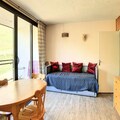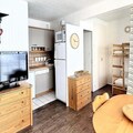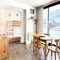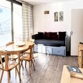 Inside, the apartment is bright and welcoming, featuring a cozy living area with a sofa bed, a flat-screen TV, and a dining table for five. The fully equipped kitchenette includes everything you need to prepare delicious meals, from a Nespresso® machine to a raclette grill for authentic alpine evenings. The alcove, separated by a curtain, provides additional sleeping arrangements with bunk beds and a pull-out bed, making this space ideal for families or small groups. A renovated shower room and ample storage complete the interior, while the residence offers convenient amenities such as a ski locker, two elevators, and parking just 50 meters away.