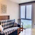 Inside, the apartment is both cozy and functional, offering a spacious 43 m² layout designed for up to six guests. The living room features a brand-new double sofa bed, a flat-screen TV, and a well-equipped kitchenette with a ceramic hob, microwave, and dishwasher. Two comfortable bedrooms provide restful retreats: one with a double bed and wardrobe, and the other with bunk beds perfect for kids or friends. The bathroom includes a bathtub and even a washing machine for added convenience. While the apartment lacks a balcony, the panoramic mountain views from the large windows more than make up for it.