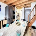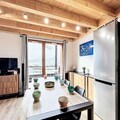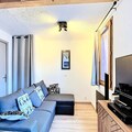 Spanning 65 m², this beautifully renovated apartment accommodates up to 10 guests, making it ideal for families or groups. The living room features a comfortable sofa bed, flat-screen TV, and a south-facing balcony with stunning slope views. The fully equipped kitchenette includes a ceramic hob, microwave, refrigerator, dishwasher, oven, and Senseo® coffee machine, ensuring you have everything needed for a cozy meal at home. Upstairs, two bedrooms with double beds and a dormitory-style room with bunk beds provide flexible sleeping arrangements. A bathroom, separate toilet, and an additional shower room upstairs ensure convenience for larger groups.