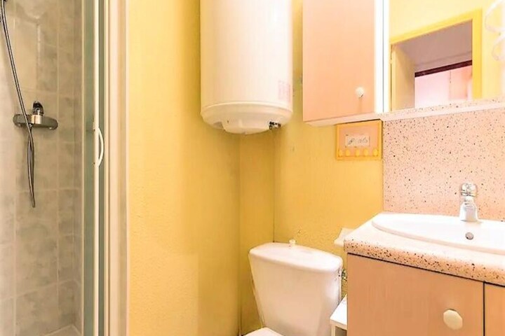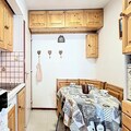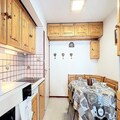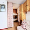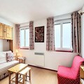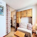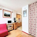The studio is thoughtfully designed to maximize comfort and functionality within its 26m² space. It accommodates up to five guests with a clever layout that includes a living area featuring a comfortable sofa bed, a single sofa bed, and a cozy alcove with bunk beds separated by a curtain for added privacy. The open-plan kitchen is fully equipped with modern appliances such as a ceramic hob, dishwasher, oven, microwave, and toaster, making it easy to prepare hearty meals after a day on the slopes. A shower room with a washing machine adds convenience, while the dining area and television create a welcoming space to relax and unwind.