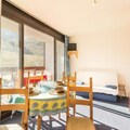 The 31m² studio is thoughtfully designed to accommodate up to four guests. The bright living area features a comfortable double sofa bed, while a curtained alcove with bunk beds offers a cozy sleeping nook for children or friends. A well-equipped kitchenette with electric hobs and a microwave allows you to prepare meals with ease, and the bathroom includes a bathtub and washing machine for added convenience. The studio is equipped with a TV, ample storage, and a ski locker on the lower level. For those staying a week or longer, enjoy complimentary access to the heated swimming pool—a perfect way to unwind after a day on the slopes.