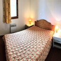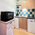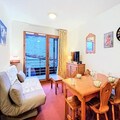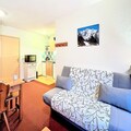Inside, the apartment is thoughtfully designed to accommodate up to six guests in comfort. The bright living room features a cozy sofa bed, a large-screen TV, and direct access to the balcony, where you can unwind with panoramic views. The well-equipped kitchenette includes everything you need to prepare hearty meals, from a ceramic hob to a Nespresso® coffee machine and even a raclette grill for authentic alpine dining. Two inviting bedrooms – one with a double bed and another with bunk beds – provide restful spaces for families or groups of friends. A separate bathroom and toilet add to the convenience, while modern amenities like a ski locker and access to a heated swimming pool enhance your stay.
