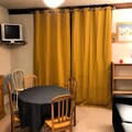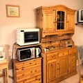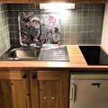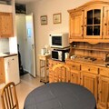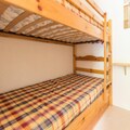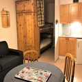 Inside, the 31m² space is thoughtfully designed for comfort and functionality. The living room, adorned with warm pine furnishings, includes a double sofa bed, a television, and a large bay window that frames stunning slope views. A separate alcove with bunk beds provides additional sleeping arrangements, making it ideal for families or small groups. The kitchenette is fully equipped with a ceramic hob, microwave, and oven, perfect for preparing hearty meals after a day on the slopes. Modern conveniences such as a washing machine and ample storage add to the ease of your stay.