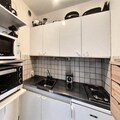 Inside, the 28m² studio is thoughtfully designed to accommodate up to four adults and one child, making it ideal for families or small groups. The sleeping alcove features bunk beds and a pull-out bed, while the living area includes a comfortable sofa bed, flat-screen TV, and a well-equipped kitchenette with a mini-oven, microwave, and raclette set for cozy evenings. The bathroom is fitted with a shower and washing machine, and a separate toilet adds extra convenience. Guests also enjoy free access to a heated swimming pool during their stay, perfect for unwinding after a day of adventure.