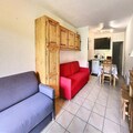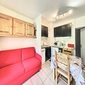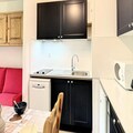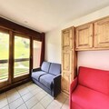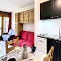 Inside, the studio is thoughtfully designed to accommodate up to four guests. The living area features two comfortable double sofa beds and a well-equipped kitchenette with modern appliances including a microwave, dishwasher, coffee maker, and raclette grill. A flat-screen TV and ample storage space complete the cozy interior, while the shower room provides practical comfort after a day on the slopes. Guests can also enjoy complimentary access to the heated swimming pool during their stay, adding a touch of luxury to the experience.