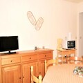 Designed for up to six guests, the 40m² apartment is both cozy and functional. The living room features a comfortable sofa bed and a television, while the well-equipped kitchenette includes a ceramic hob, dishwasher, refrigerator, and even a fondue set for those quintessential alpine evenings. Two bedrooms provide restful retreats: one with bunk beds and the other with a double bed. A separate bathroom and toilet ensure convenience for all. Guests also enjoy complimentary access to the heated swimming pool, perfect for unwinding after a day on the slopes.
