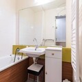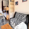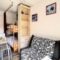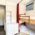 Inside, the 22m² studio is thoughtfully arranged to accommodate up to four guests. The living area features a comfortable double sofa bed and two bunk beds, separated by a curtain for added privacy. A compact yet fully equipped kitchenette invites you to prepare hearty meals after a day on the slopes, complete with electric hobs, a mini-oven, microwave, dishwasher, and coffee maker. Modern amenities like a flat-screen TV and free Wi-Fi ensure a relaxing and connected stay, while the heated swimming pool adds a touch of luxury to your alpine escape.