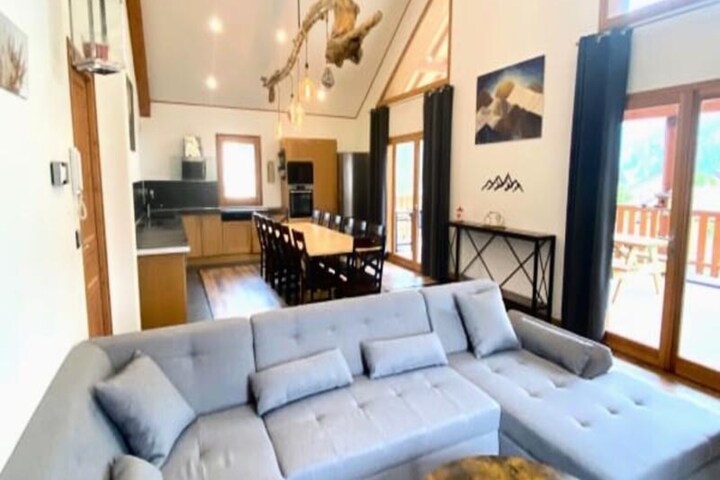 The apartment features a bright, open-plan living room with a fully equipped kitchen, perfect for preparing meals or hosting gatherings. The kitchen includes modern appliances such as an oven, dishwasher, and refrigerator, along with raclette machines for a traditional meal. Two modern bathrooms offer a bathtub for relaxation and a shower for convenience. A spacious 30m² terrace provides outdoor seating and a plancha, perfect for enjoying the mountain views and fresh air.