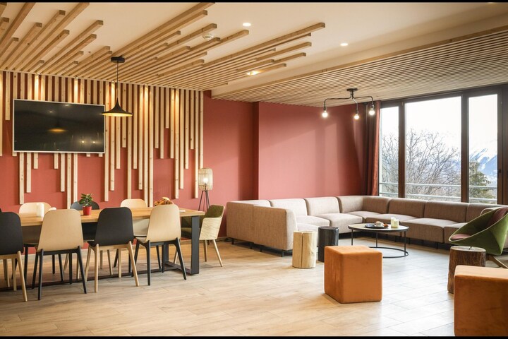 Welcome to our exquisite apartment, ideal for families or groups seeking a comfortable retreat. The spacious living room serves as the heart of the home, featuring a cozy double sofa bed, a TV for entertainment, and a charming fireplace that adds warmth and ambiance. An inviting seating area is perfect for relaxing and enjoying quality time together after a day of exploration.