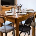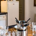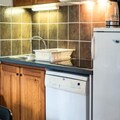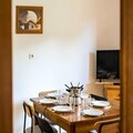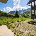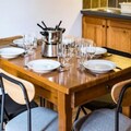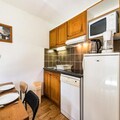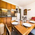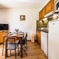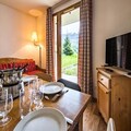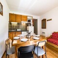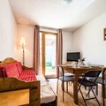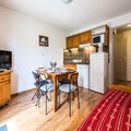 The apartment comfortably accommodates up to four guests, featuring a double bedroom and a mountain alcove with bunk beds. The living area exudes warmth with its inviting decor, television, and an open kitchen equipped with everything you need to prepare hearty Savoyard meals, including raclette and fondue sets. Step outside to a small private outdoor space, where a table and chairs await for you to soak in the crisp alpine air and stunning vistas. A dedicated ski locker ensures your equipment is always ready for the next adventure.