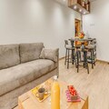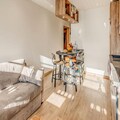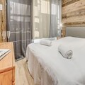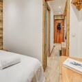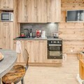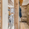 Inside, the apartment combines modern comfort with alpine charm. The 38 m² space features a south-facing terrace, offering stunning views and a sunlit ambiance. The layout includes a cozy bedroom with a double bed and storage, a cabin with bunk beds, and a living room with a convertible sofa bed. The open-plan kitchen is fully equipped with a refrigerator, ceramic hobs, oven, microwave, and dishwasher, making meal preparation a breeze. Additional amenities such as a ski boot drying heater, walk-in shower, and private ski locker ensure a seamless stay.