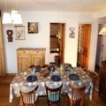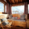 Chalet Bobech Apartment No. 3 is a cozy, 70m² space designed to accommodate up to six guests. Its warm wooden interiors and antique furnishings create a welcoming atmosphere, while the large east- and south-facing windows flood the living spaces with natural light. The apartment features a living room with a flat-screen TV, a dining area, and a fully equipped kitchen with modern appliances. Two bedrooms provide flexible sleeping arrangements, including a double bed and single bed in one room and a double bed with an en-suite bathroom in the other. Additional amenities include a ski storage area, free Wi-Fi, and a terrace that opens to breathtaking alpine views.